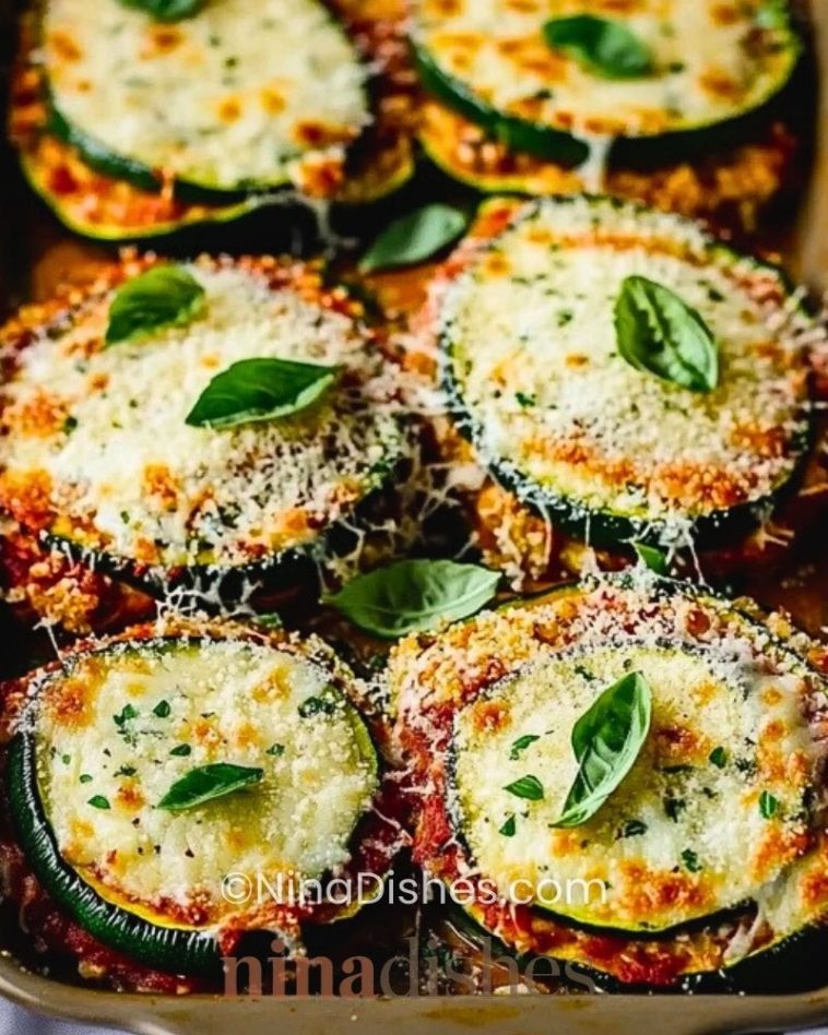 - Assemble the Dish: Preheat oven to 375°F (190°C). Spread marinara sauce in a baking dish, layer the fried zucchini, add more marinara sauce, and top with mozzarella and parmesan cheese.